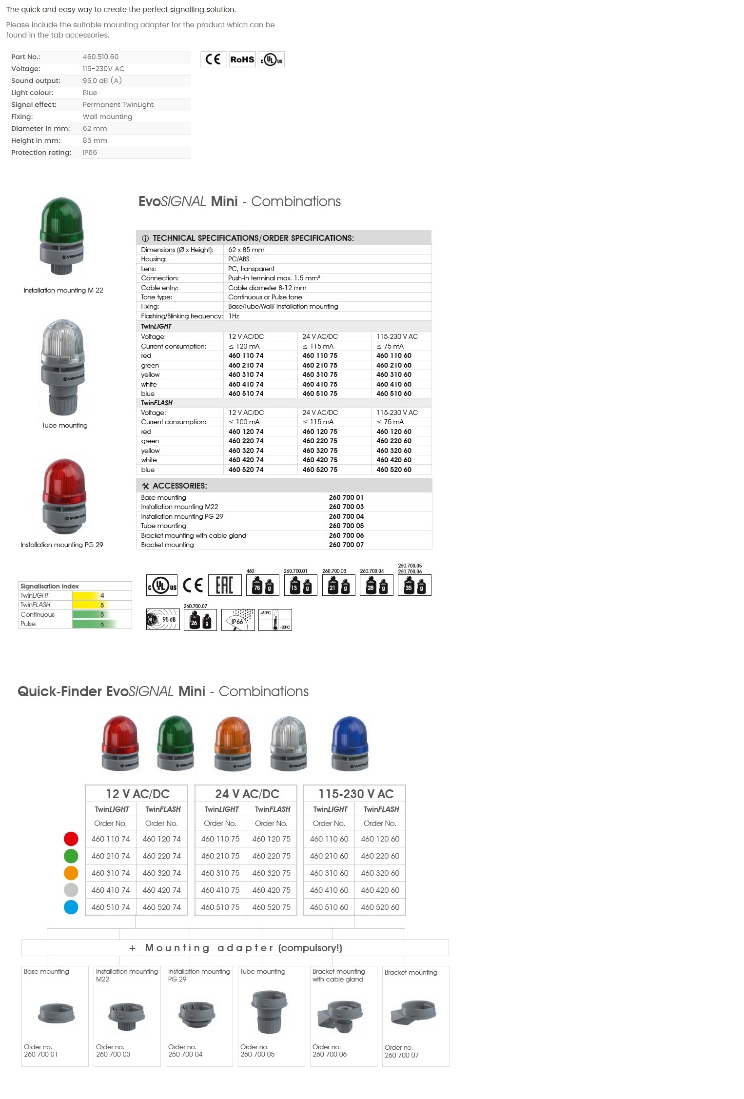 WERMA EvoSignal 460.510.60 Blue Twin Light Beacon With Sounder, 115V / 230V AC (Additional Mounting Adapter Needed) |  |