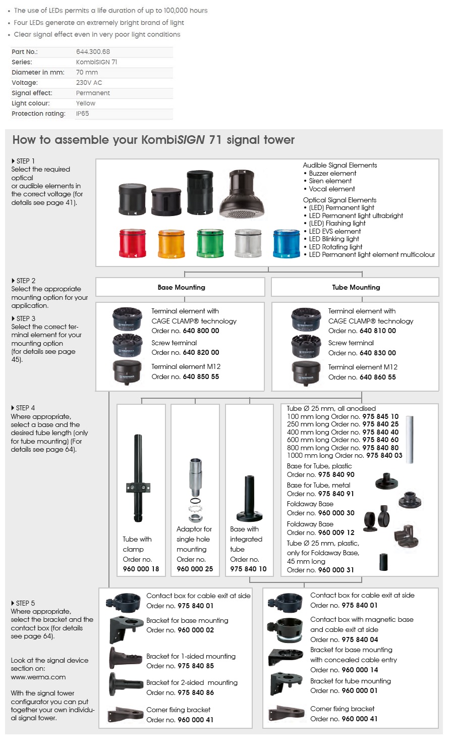 WERMA KombiSIGN 71 644.300.68 Modular Signal Tower Light - 230V AC LED Permanent Light Yellow Colour Element