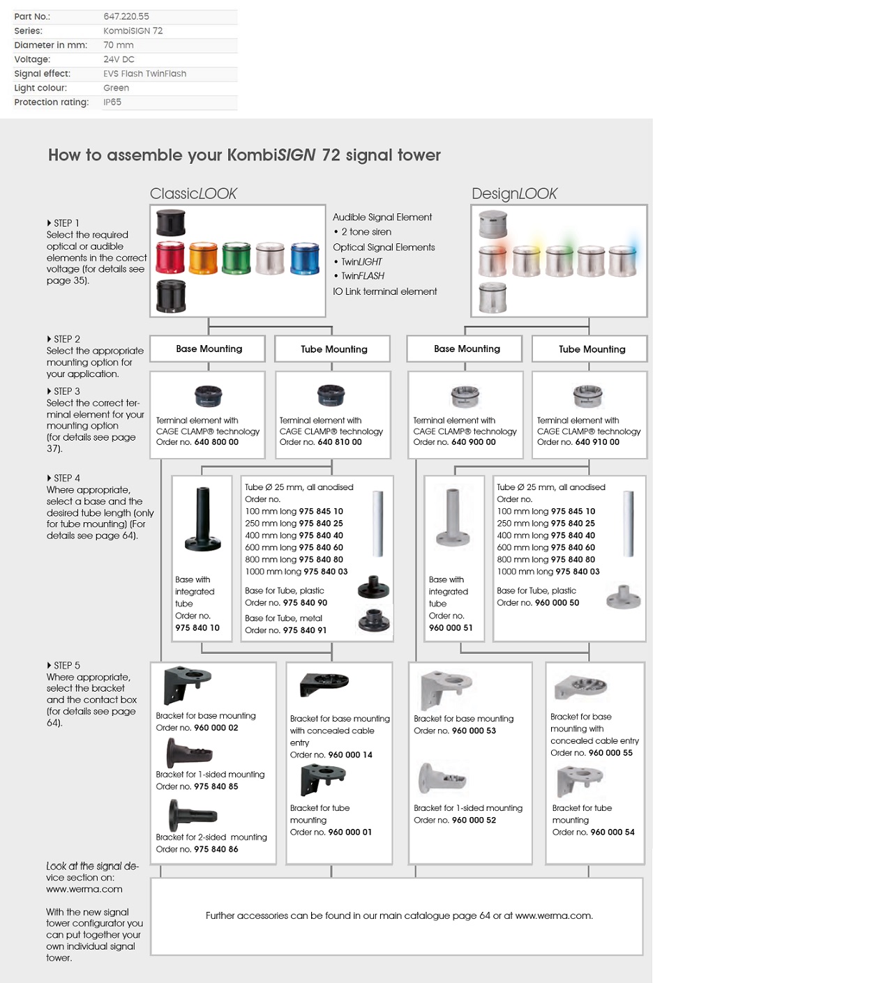 WERMA KombiSIGN 72 647.220.55 Modular Signal Tower Light - Classic Look 24V DC Green Colour Twin Flash Elements